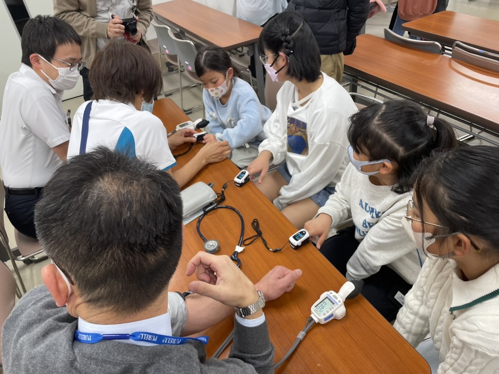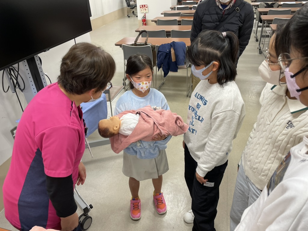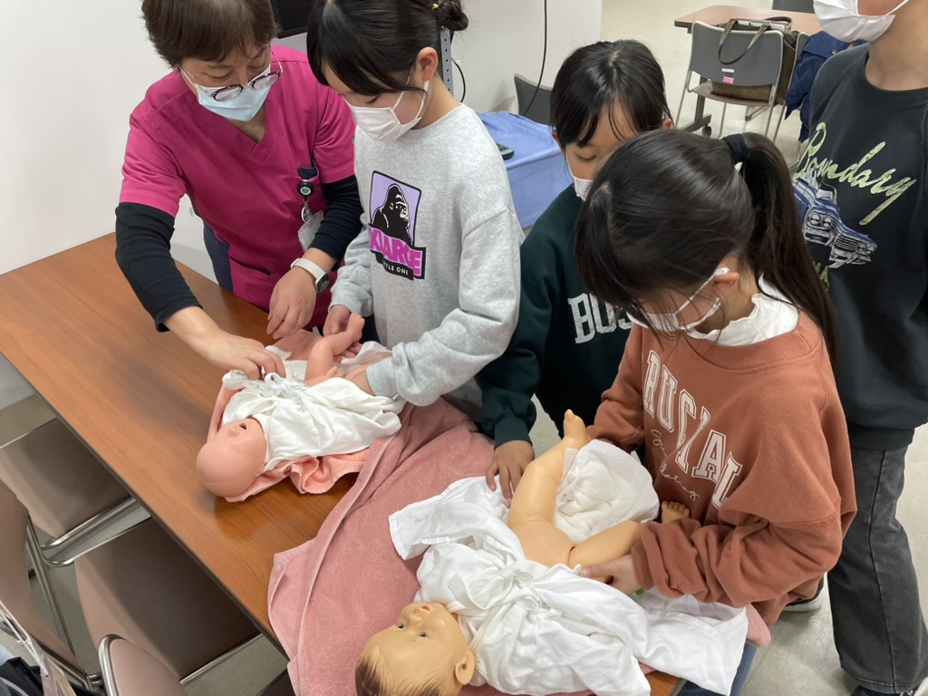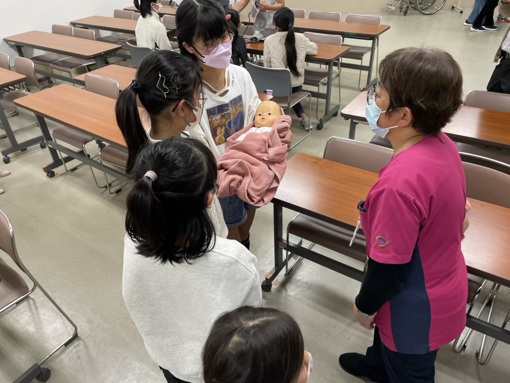 赤ちゃん人形の看護体験では、人形がずっしり重く、首の支え方ひとつで安全が変わることを知り、命をあずかる仕事の重さを感じ、自然と動きが慎重になりました。